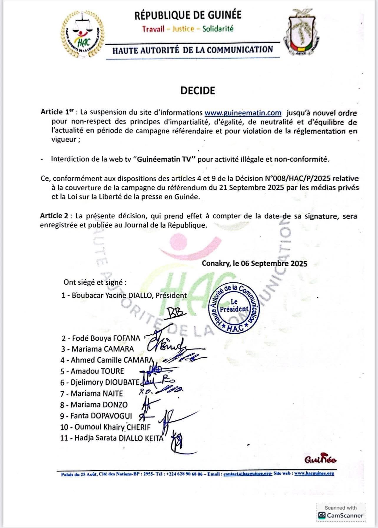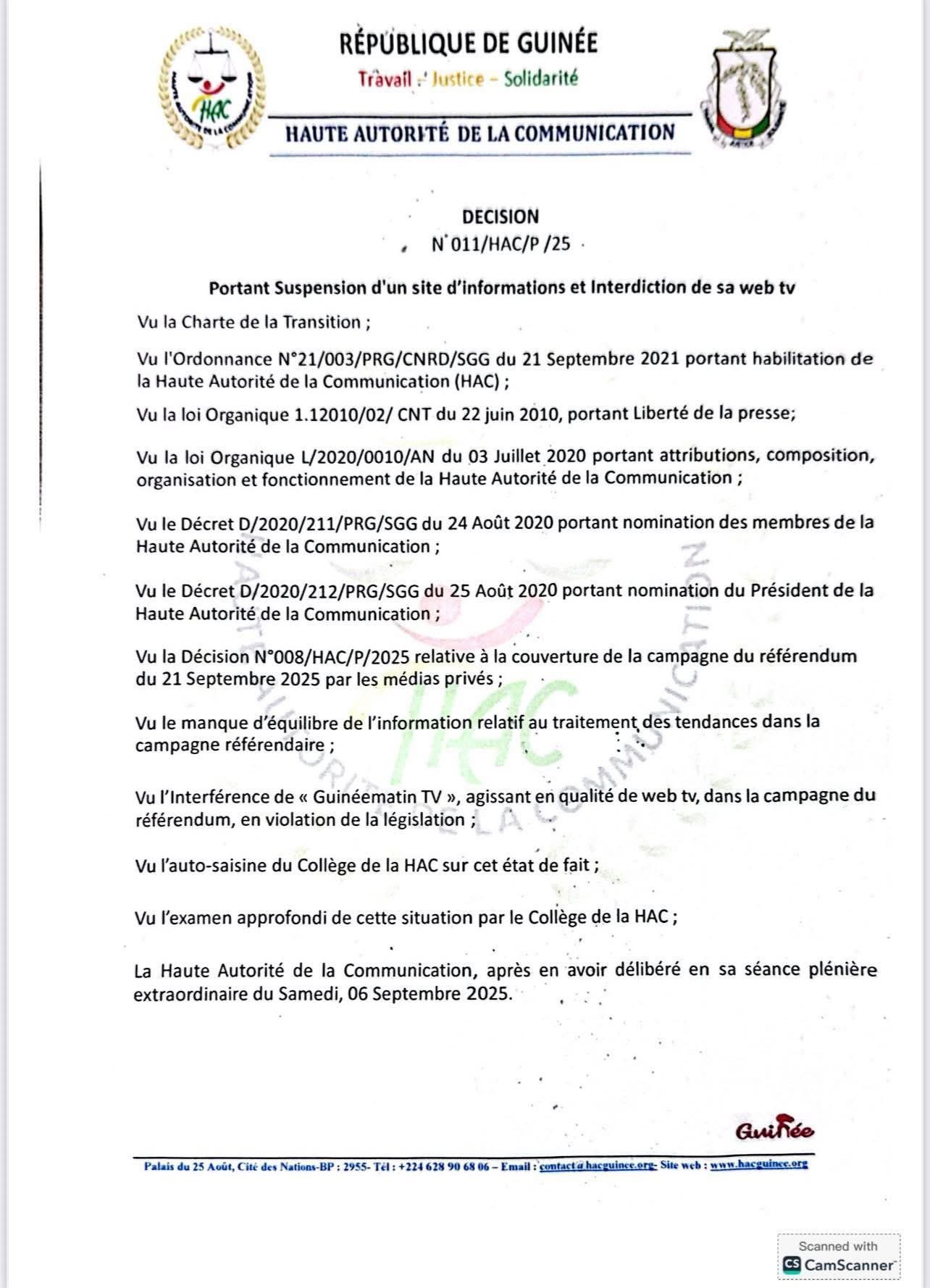 « Interdiction de la web TV Guinéematin TV pour activité illégale et non-conformité », précise la décision, qui s’appuie sur la Loi sur la liberté de la presse en Guinée ainsi que la Décision N°008/HAC/P/2025 relative à la couverture de la campagne du référendum du 21 septembre 2025.
