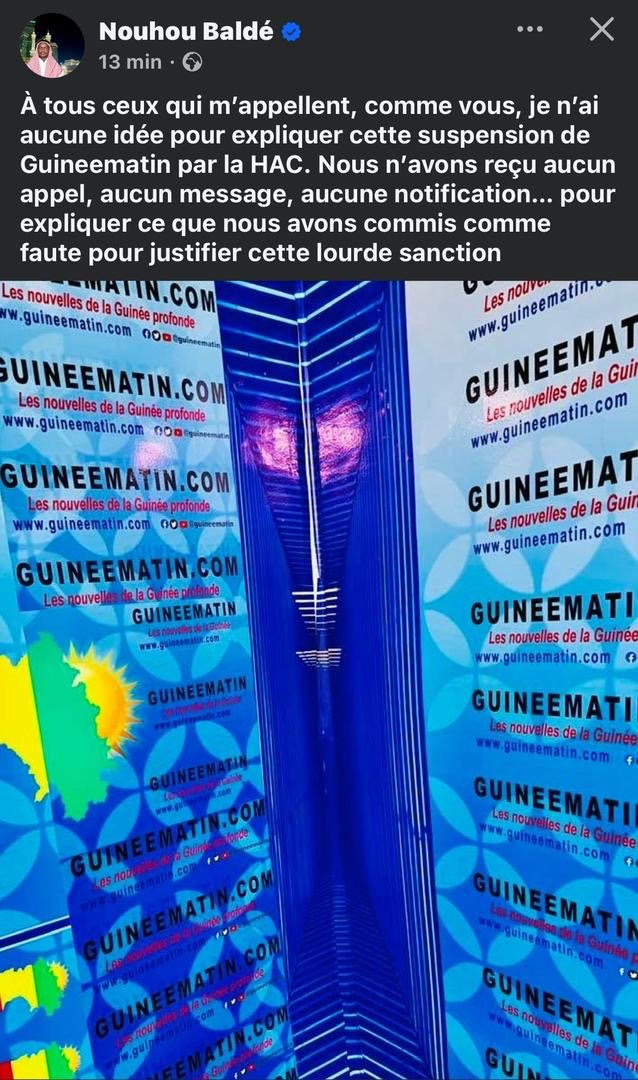 « À tous ceux qui m’appellent, comme vous, je n’ai aucune idée pour expliquer cette suspension de Guineematin par la HAC. Nous n’avons reçu aucun appel, aucun message, aucune notification… pour expliquer ce que nous avons commis comme faute pour justifier cette lourde sanction », a-t-il déclaré.
