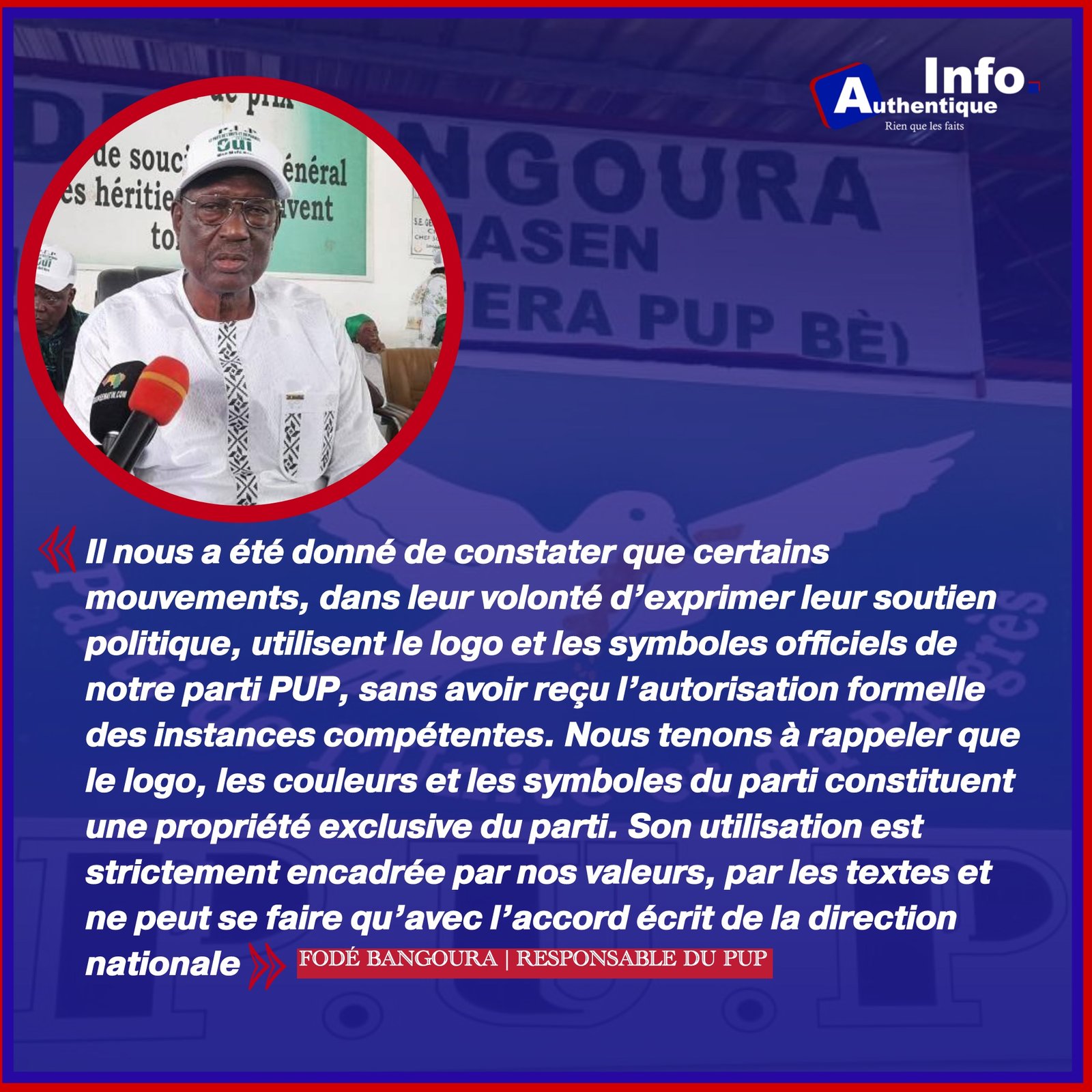 “Il nous a été donné de constater que certains mouvements, dans leur volonté d’exprimer leur soutien politique, utilisent le logo et les symboles officiels de notre parti PUP, sans avoir reçu l’autorisation formelle des instances compétentes. Nous tenons à rappeler que le logo, les couleurs et les symboles du parti constituent une propriété exclusive du parti. Son utilisation est strictement encadrée par nos valeurs, par les textes et ne peut se faire qu’avec l’accord écrit de la direction nationale”, a-t-il averti.