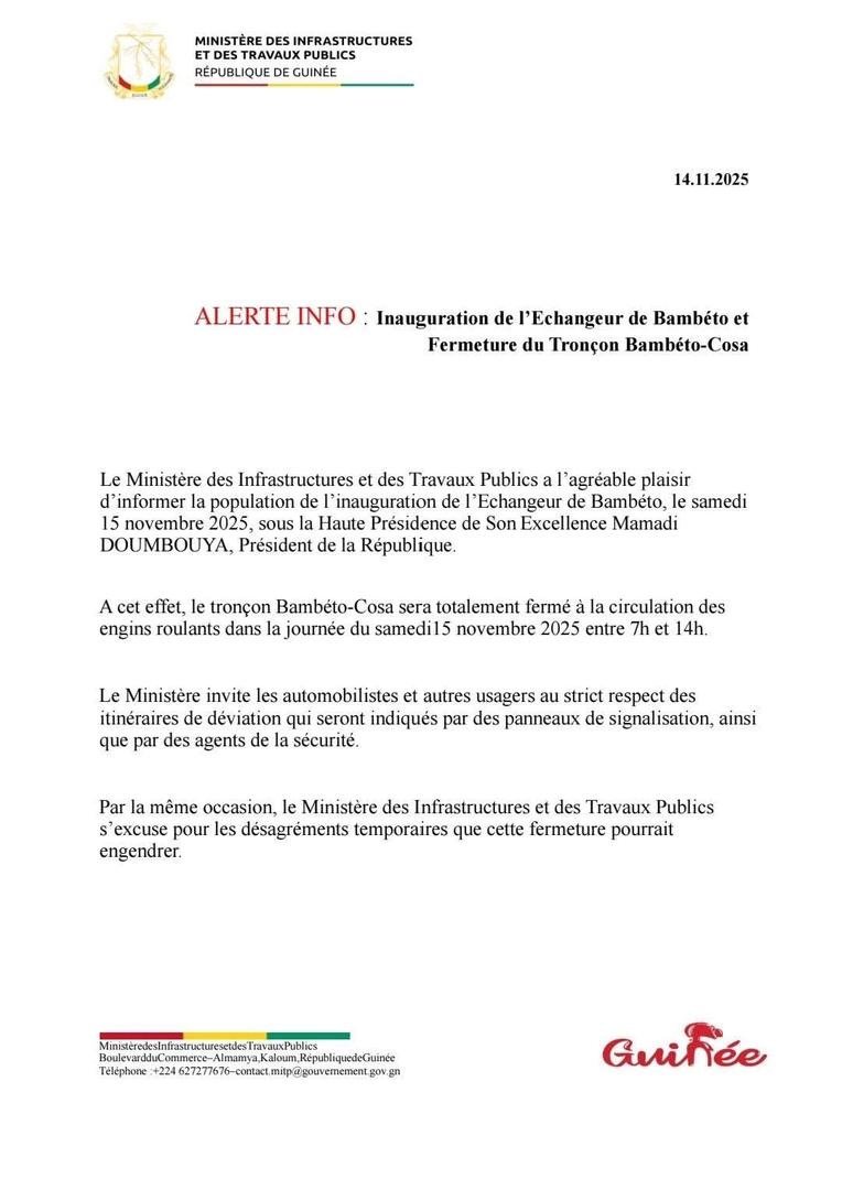 Le Ministère des Infrastructures et des Travaux Publics annonce que l’échangeur de Bambéto sera inauguré le samedi 15 novembre 2025, sous la présidence de Son Excellence Mamadi Doumbouya.