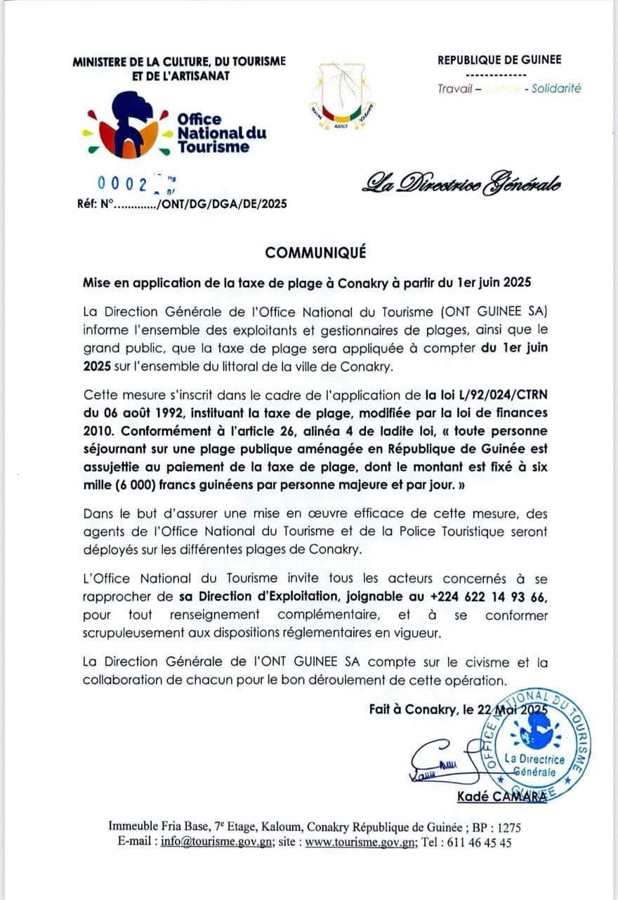 À compter du 1er juin 2025, la taxe de plage sera officiellement appliquée sur l’ensemble du littoral de la ville de Conakry. L’annonce a été faite par la Direction Générale de l’Office National du Tourisme, à l’intention des exploitants de plages, des gestionnaires ainsi que du grand public.
