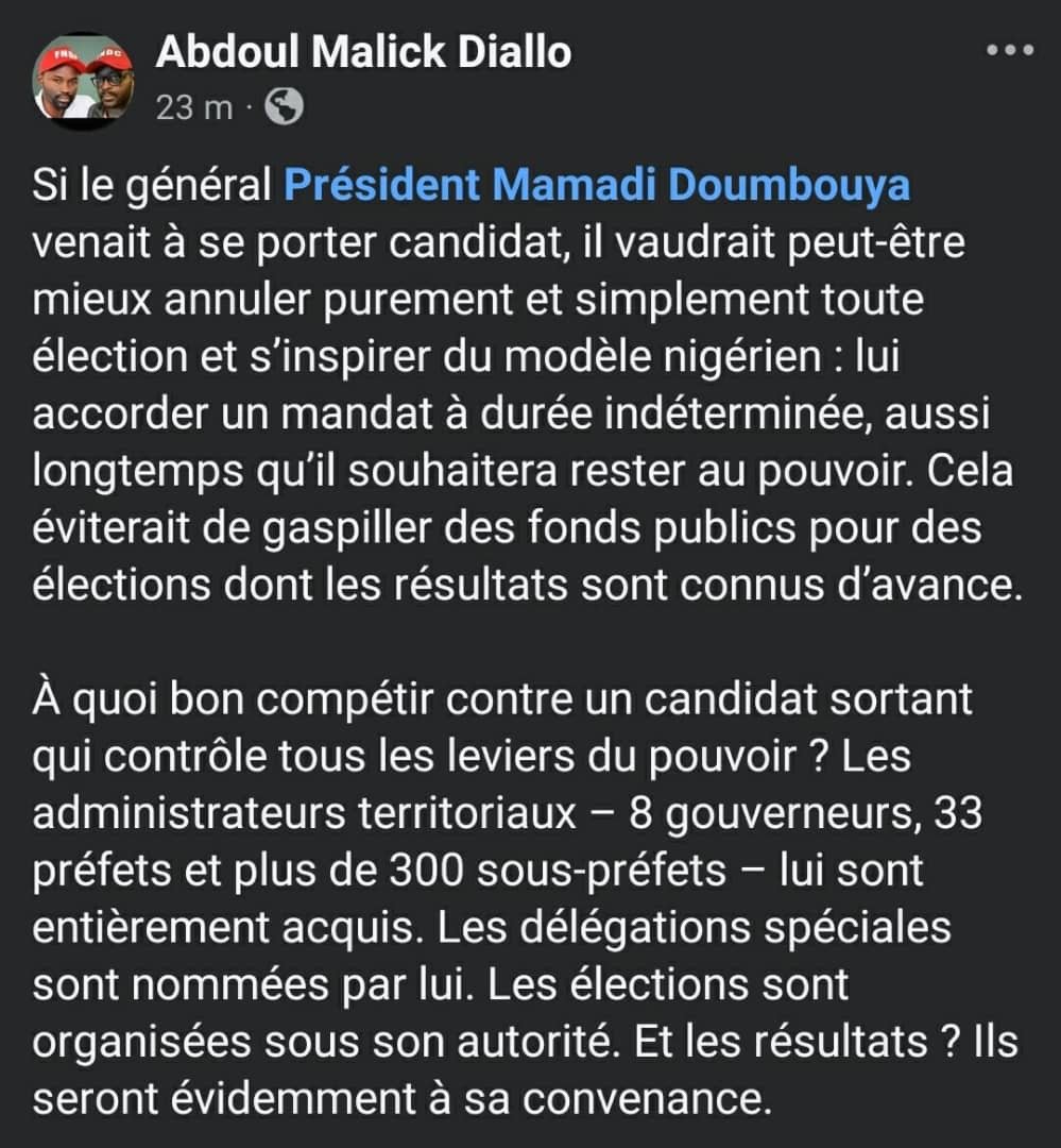 « Si le général-président Mamadi Doumbouya décide de se présenter, autant annuler les élections et s’inspirer du modèle nigérien : lui accorder un mandat à durée indéterminée, aussi longtemps qu’il le souhaite », a-t-il écrit.