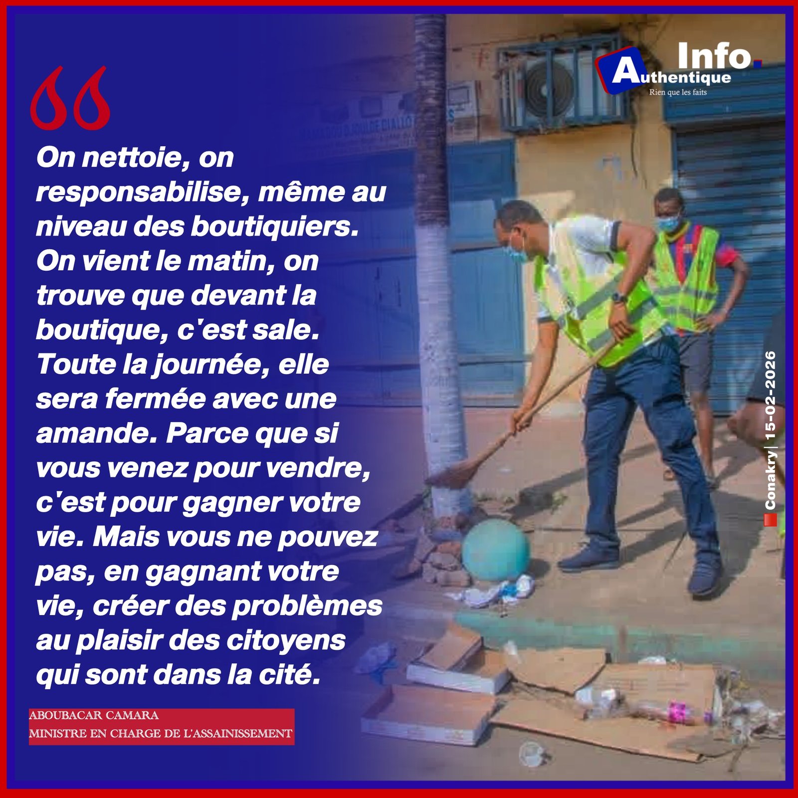 Le ministre de l’Assainissement, Aboubacar Camara, a mené ce dimanche 15 février 2026 une opération « coup de poing » dans la commune de Kaloum, centre administratif de Conakry.