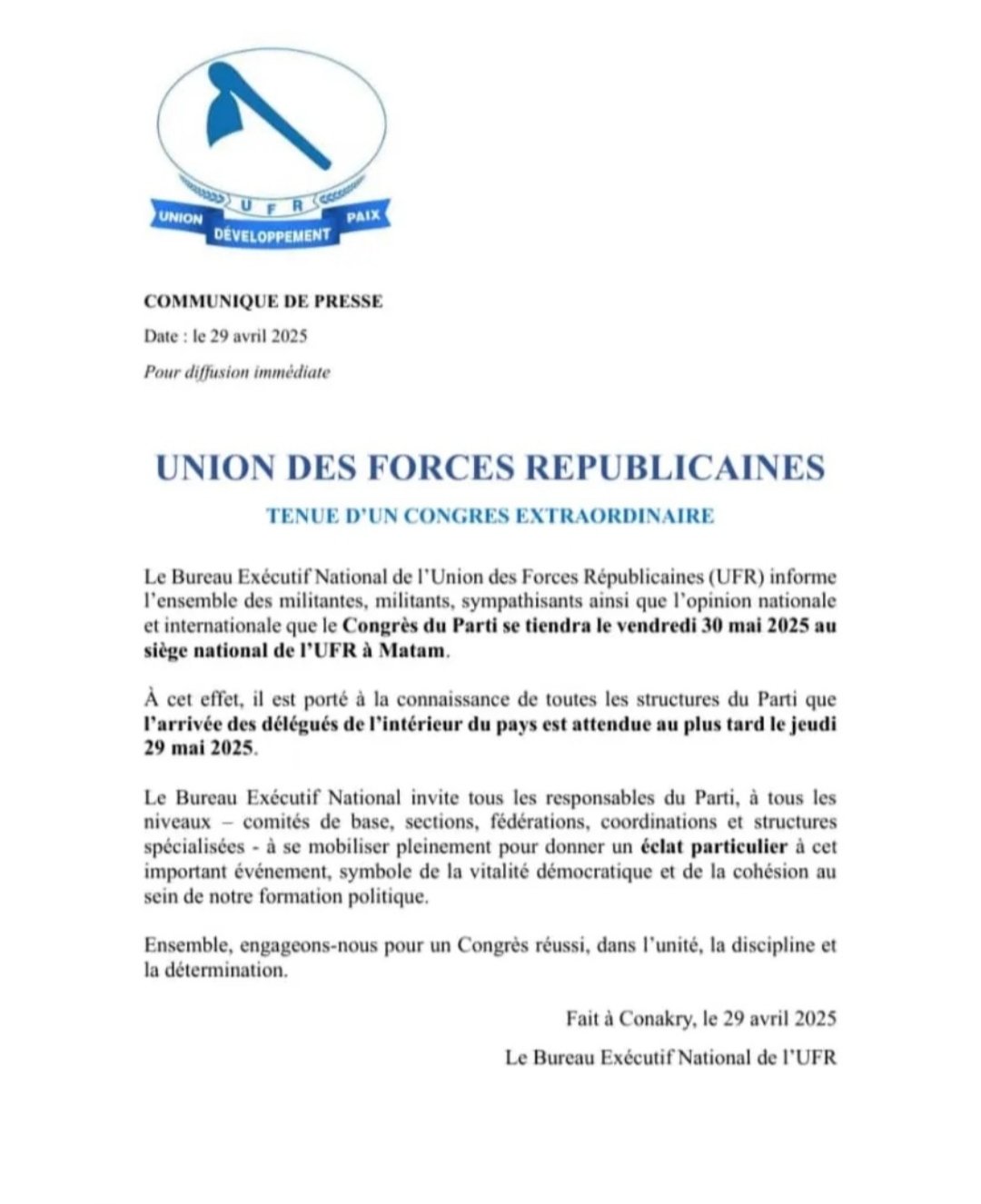 L’Union des Forces Républicaines (UFR) tiendra un congrès extraordinaire le vendredi 30 mai 2025 au siège national du parti, à Matam, dans Conakry. L’information a été rendue publique par le Bureau Exécutif National à travers un communiqué daté du 29 avril.