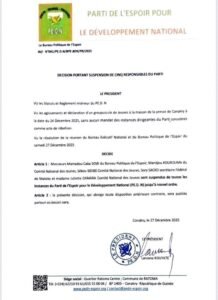 Selon le document officiel, ces actes ont été considérés comme une « rébellion » au regard des textes du parti. La mesure de suspension s’appuie également sur une résolution issue d’une réunion conjointe du Bureau exécutif national et du Bureau politique du PEDN, tenue le samedi 27 décembre 2025.