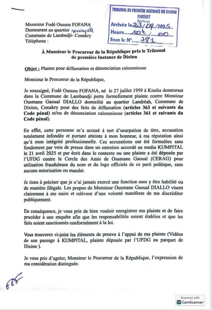 Le vice-président de l’UFDG, Dr Fodé Oussou Fofana, vient de porter plainte au Tribunal de Première Instance de Dixinn contre le ministre des Transports, Porte-parole du gouvernement de la transition, Ousmane Gaoual Diallo, pour des faits de diffamation et dénonciation calomnieuse.