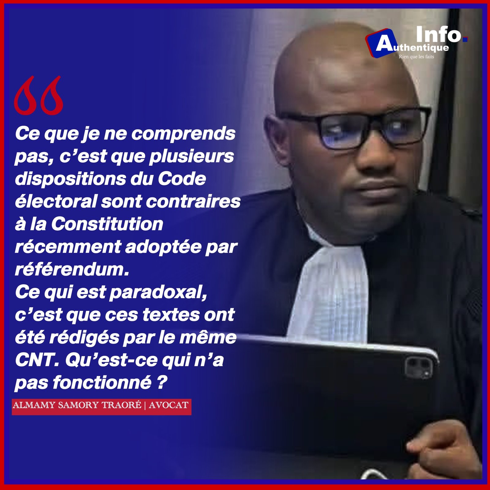 Bien que tous deux aient été élaborés par le Conseil national de la transition (CNT), le Code électoral contredirait certaines dispositions de la nouvelle Constitution. C’est ce qu’affirme Me Almamy Samory Traoré, avocat à la Cour.